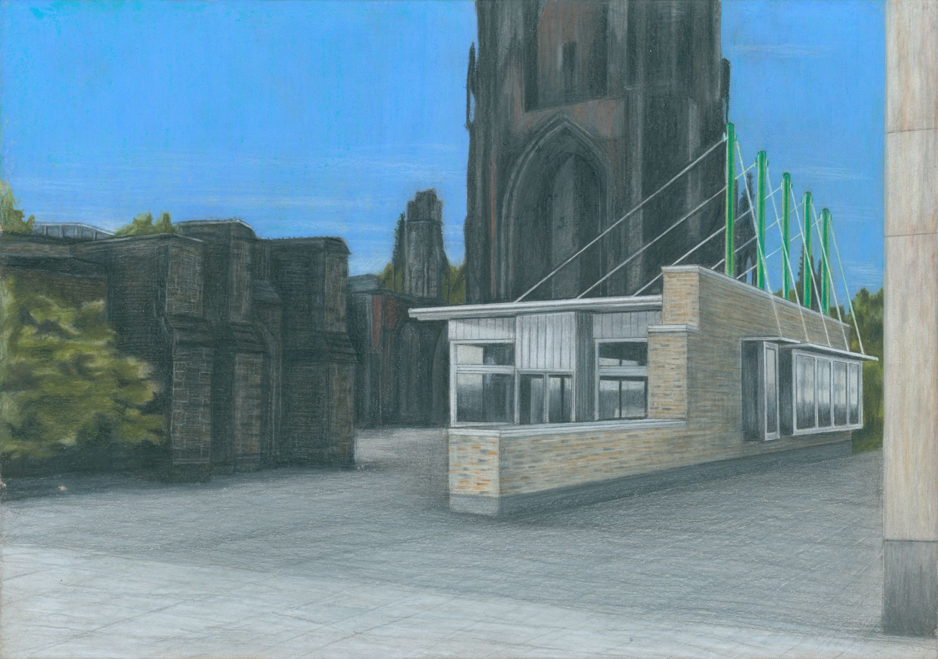 Who wants to sit in a basement when the sun is shining outside? Since ambitious solutions were requested, we consider meeting rooms in a crypt to be inappropriate. Instead, as already announced in the competition title, we propose a comprehensive reorganization of the St. Nikolai memorial. We achieve this with a few, targeted interventions. We rely on simple structures supported by slender steel tubes. We dissolve the previous spatial concept of the memorial, as fragments were previously presented on pedestals, similar to how Cologne Cathedral was once placed on a platform or how the ruins of the Kaiser Wilhelm Memorial Church were exhibited. Our approach: to understand the ruin as a whole and create a place of tranquility and remembrance. The most important message for visitors: the ruins must be protected so that such destruction never happens again and ruins have always been protected with simple shelter structures with metal roofs.